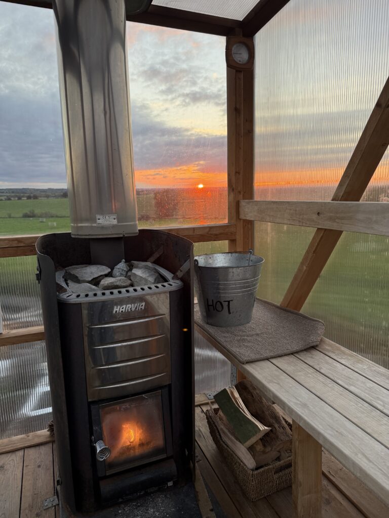 A sauna with a panoramic view over Oxfordshire offers an immersive and serene experience, blending wellness with the natural beauty of the English countryside. This unique setup is designed to provide users with a full-spectrum visual treat while they relax and rejuvenate in the warmth of the sauna.